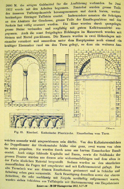 Kierdorf ist wahrscheinlich an der Heerstrasse von Köln nach Aachen entstanden, es liegt westlich von Hürth und Brühl in Nordrhein-Westfalen). Sie wurde 1912 instand gesetzt. Paul Thomas hatte die Bauleitung, und verfaßte den Bericht nebst Zeichnungen. Die Beschreibungen der Details lassen sich an der heutigen Kirche (leider bei regnerischem Wetter aufgenommen)gut wiedererkennen: