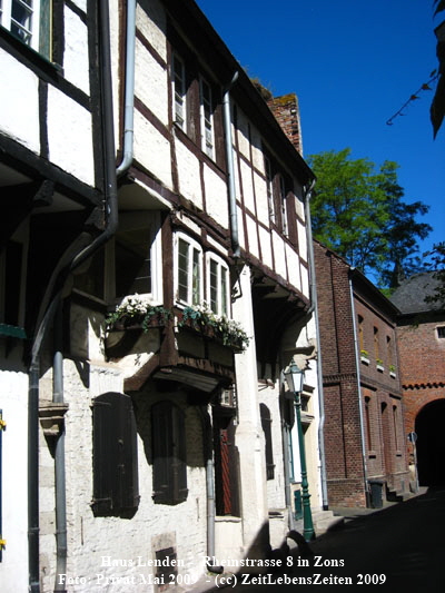 „Haus des (damals) Nicolaus Lenden in der Zonser Altstadt, Rheinstrasse 8. Das Haus existiert noch und ist denkmalgeschützt. Ein genaues Erbauungsdatum ist nicht bekannt. Es ist aber mit allergrößter Wahrscheinlichkeit im 17. Jh. erbaut worden, also nach dem letzten großen Stadtbrand 1620. Zu Beginn des 20. Jahrhunderts gab es seitens des Landeskonservators erhebliche Anstrengungen (um Umsetzungen), das Zonser Stadtbild zu erhalten und instand zu setzen, insbesondere konzentriert auf die Festungsbauwerke. In dem Zuge hat man sich offenbar in einem zweiten Schritt auch der ältesten Häuser in der Rheinstraße angenommen.” ( 20.7.2008).